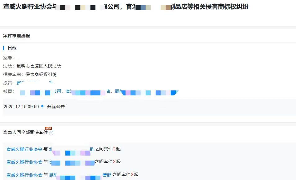 2025年,他收到一封法院的传票——宣威火腿行业协会起诉他的食品经营部和某腌腊制品店、北京某科技有限公司侵害商标权。这次诉讼的起因正是当时他在网上售卖“宣威火腿”,在产品和广告标题上显示有“宣威火腿”四个字,“我当时的标题是把它们连在一起,然后就被告了,对方说不可以。”