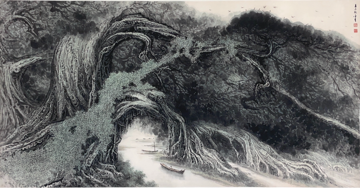 陈金章,1929年生于广东省化州县,1947年考入广州市立艺专,专攻中国画,师承岭南画派巨匠高剑父、黎雄才、关山月等。作为岭南画派第三代的代表人物,陈金章不仅继承了前人的精神,更以创新的手法将岭南画派推向了新的高度。他对点、擦、皴、染等传统技法的精妙运用与西洋绘画优点的巧妙融合,久久99精品久久久久久秒播放器在本次展览中的《榕乡》《飞瀑云山》等作品中得到了充分的体现,展现了其深厚的绘画功底和对自然美的深刻理解。
