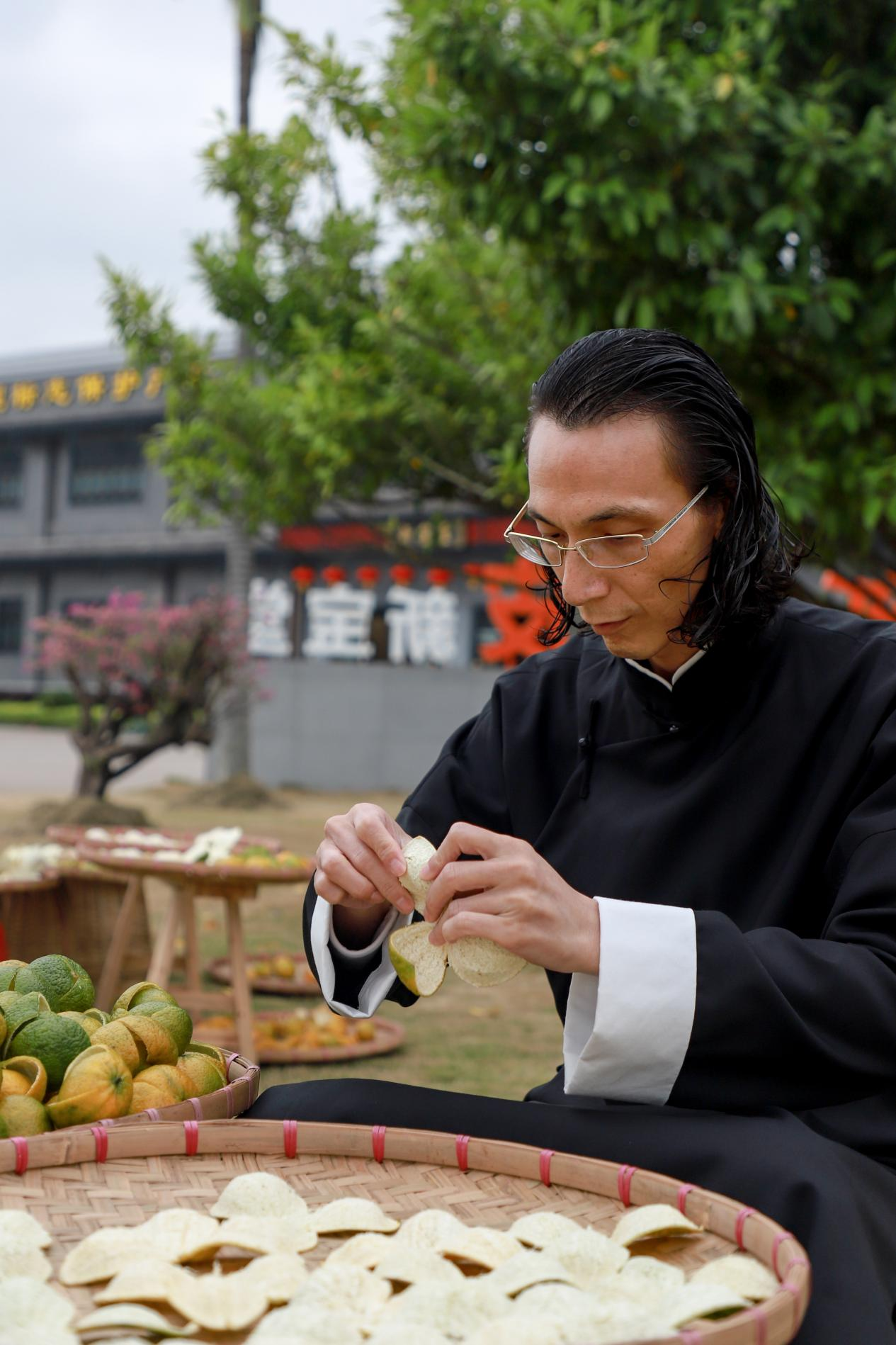 国家级非物质文化遗产新会陈皮炮制技艺包含“采摘、开皮、翻皮、晒皮、陈化”五大步骤,在新会陈皮炮制技艺传承中,新宝堂陈氏“顺天陈”法传承与创新了新会陈皮炮制技艺,至今已传承百年。陈氏“顺天陈”法不仅是一种制作方式,更是一种生活哲学。这一技艺强调顺应天时,因时制宜,在陈皮制作的每一个环节都严格遵循自然规律。新宝堂第四代传人陈柏忠在前人的经验中,总结出一套科学严谨的新会陈皮炮制技艺,制作讲究时令节气、流程覆盖选种育苗、果树培植等各环节,尊重自然,不逆天工。